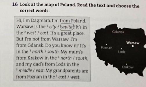 Hi, im Darmaga. I'm frrom Poland. Warshaw is the capital. Its in the east . It's a great place. But i'm not from Warshaw I'm from Gdansk. Do you know it? It's in the north. My mom is from Krakov in the south. And my dad's from Lodz in the middle. My grandparents are from Poznan in the west.
