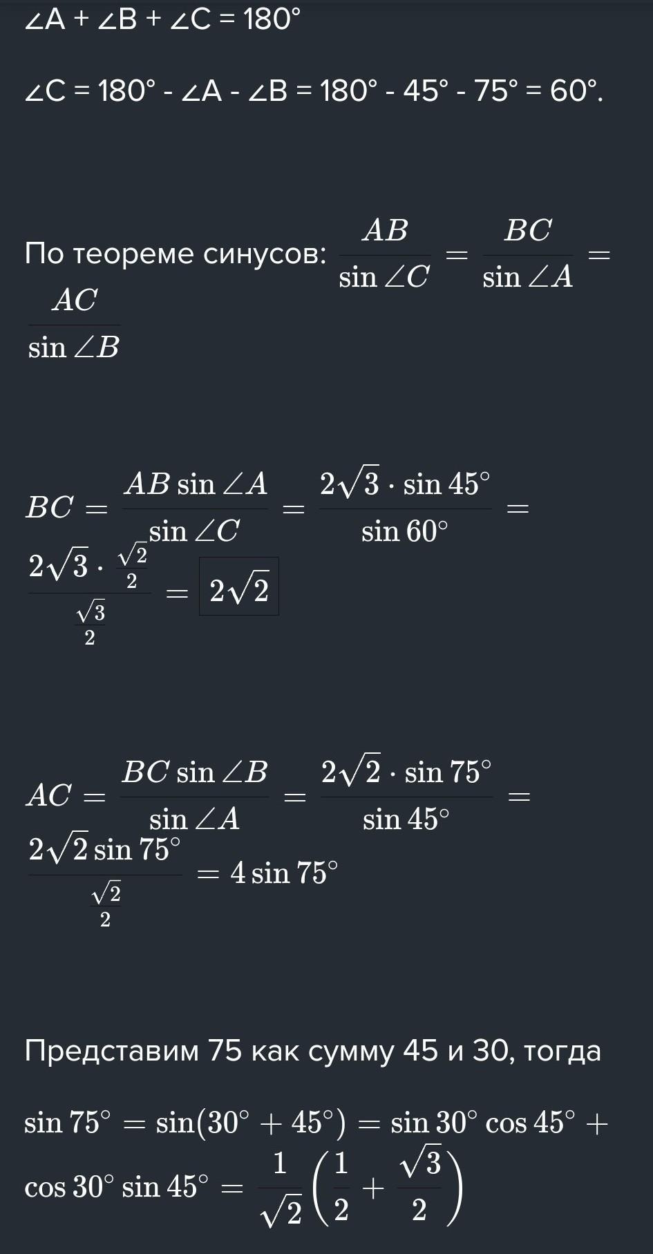 Ответ: ∠C = 60°; BC = 2√2; AC = √2 + √6.