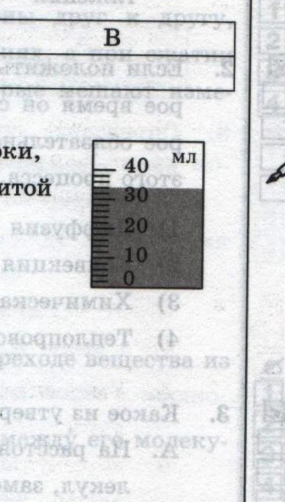 Предел измерений мензурки — 40мл. Цена деления = 2мл (40 — 30): 5 = 2). Объем налитой жидкости — 32 мл. Ответ №2 40 мл C= (40-30)/5=2 (мл/дел) V=34 мл.