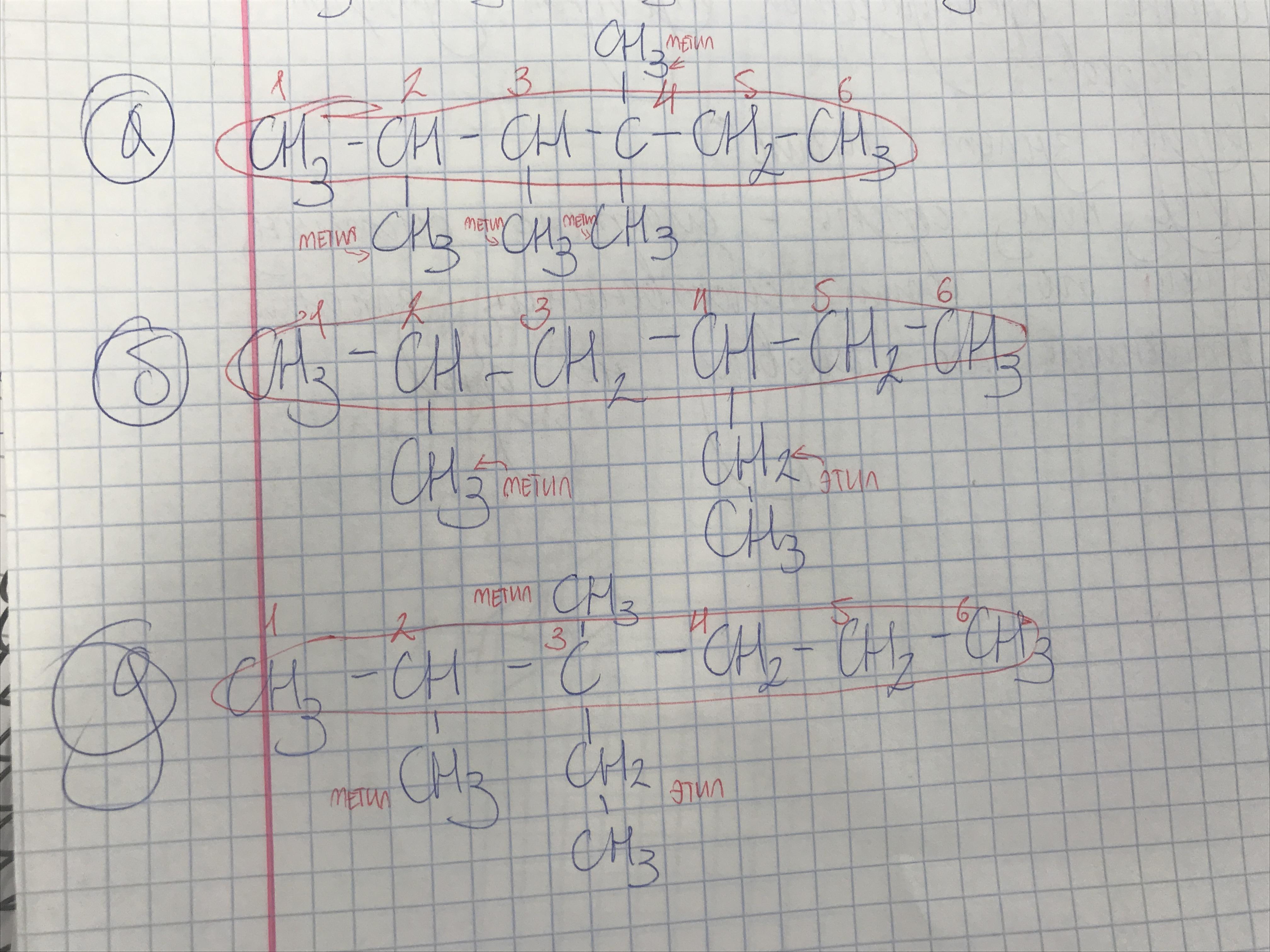 та же самая ситуация, как и в варианте «а», тут также нужно выделить наиболее длинную цепочку, расположение радикалов вследствие этого также изменится.