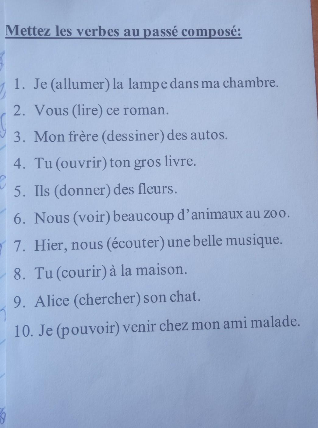 J'ai allumé Vous avez lis Frère a dessiné Tu a ouvert lls vont donné Nous avons vu Nous avons écouté Tu a court Alice a cherché J'ai pu