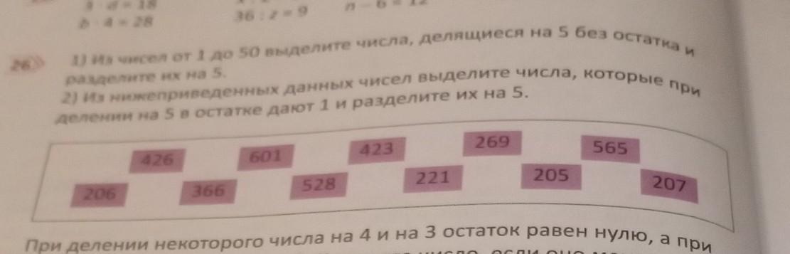 Из чисел от 1 до 50 выделите числа, де разделите их на 5. цис по 2) Из нижеприведенных данных чисел выделите числа, которые при делении на 5 в остатке дают 1 и разделите их на 5. 269 565 423 426 601 205 221 207 528 206 366 и на 3 остаток равен нулю, а при