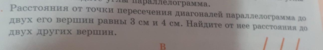 4. Расстояния от точки пересечения диагоналей параллелограмма до двух его вершин равны 3 см и 4 см. Найдите от нее расстояния до двух других вершин.