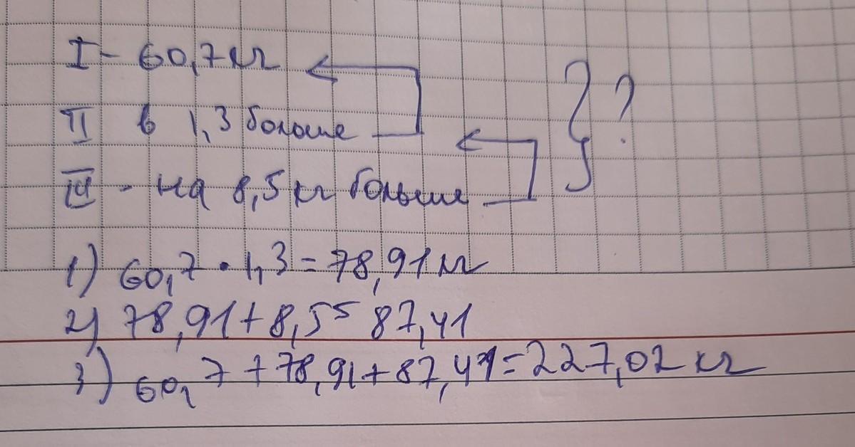 Собранный урожай картофеля разложили в три ящика. В первый ящи положили 60,7 кг картофеля, во второй положили в 1,3 раза больше, чел первый, а в третий положили на 8,5 кг больше, чем во второй. Сколько всего килограммов картофеля было собрано?