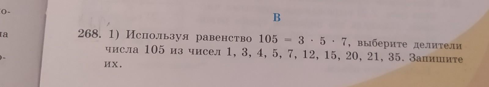 В 268. 1) Используя равенство 105 = 3. 5. 7, выберите делители числа 105 из чисел 1, 3, 4, 5, 7, 12, 15, 20, 21, 35. Запишите их.