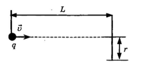 Из точечного источника вылетают α-частицы массой m и зарядом q и движутся в однородном магнитном поле с индукцией В, силовые линии которого перпендикулярны плоскости рисунка. На расстоянии L от источника находится мишень радиуса r. При каких значениях скорости α-частицы попадут на поверхность мишени?