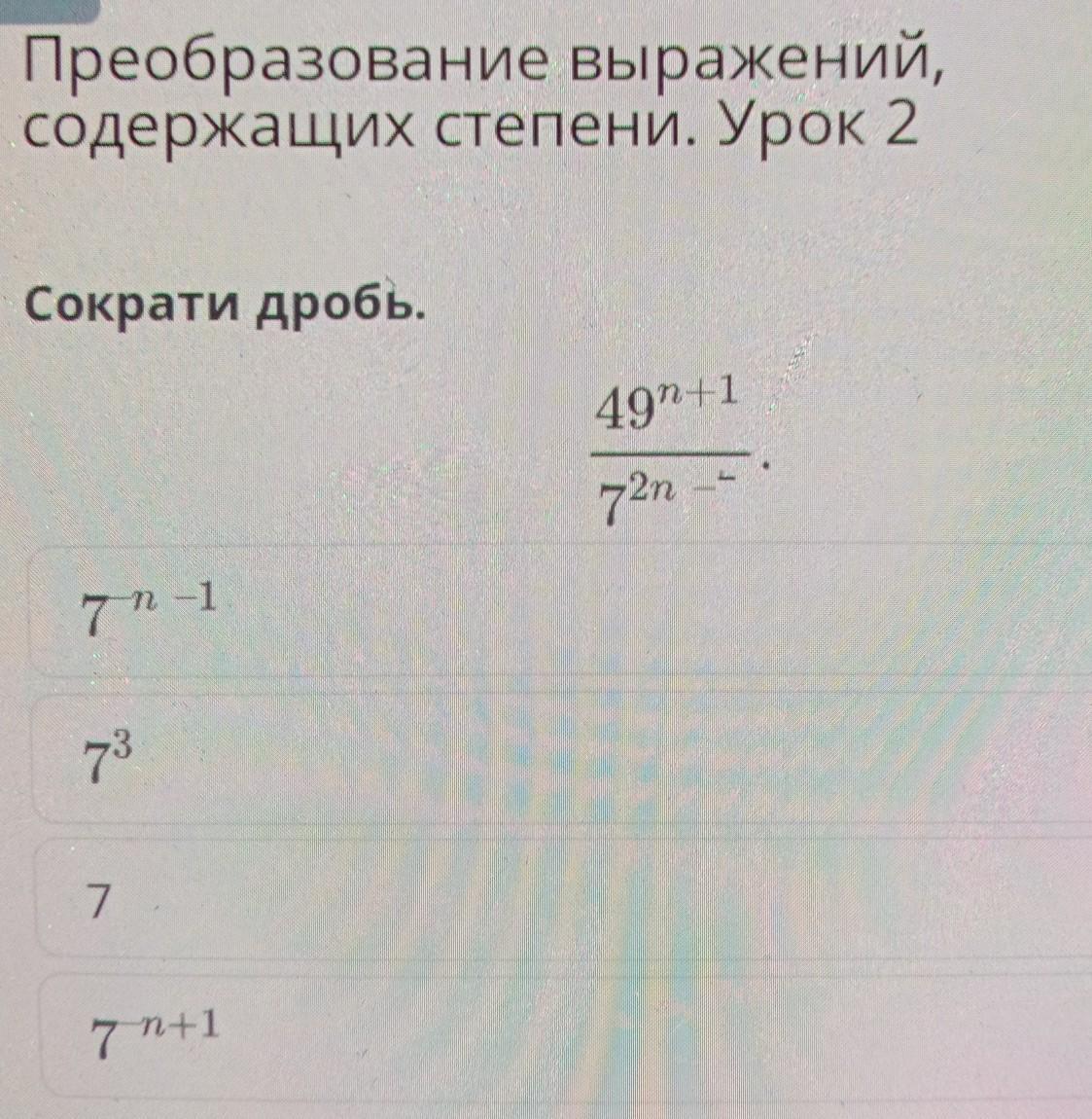 E Преобразование выражений, содержащих степени. Урок 2 Сократи дробь. 49n+1 /7²n-