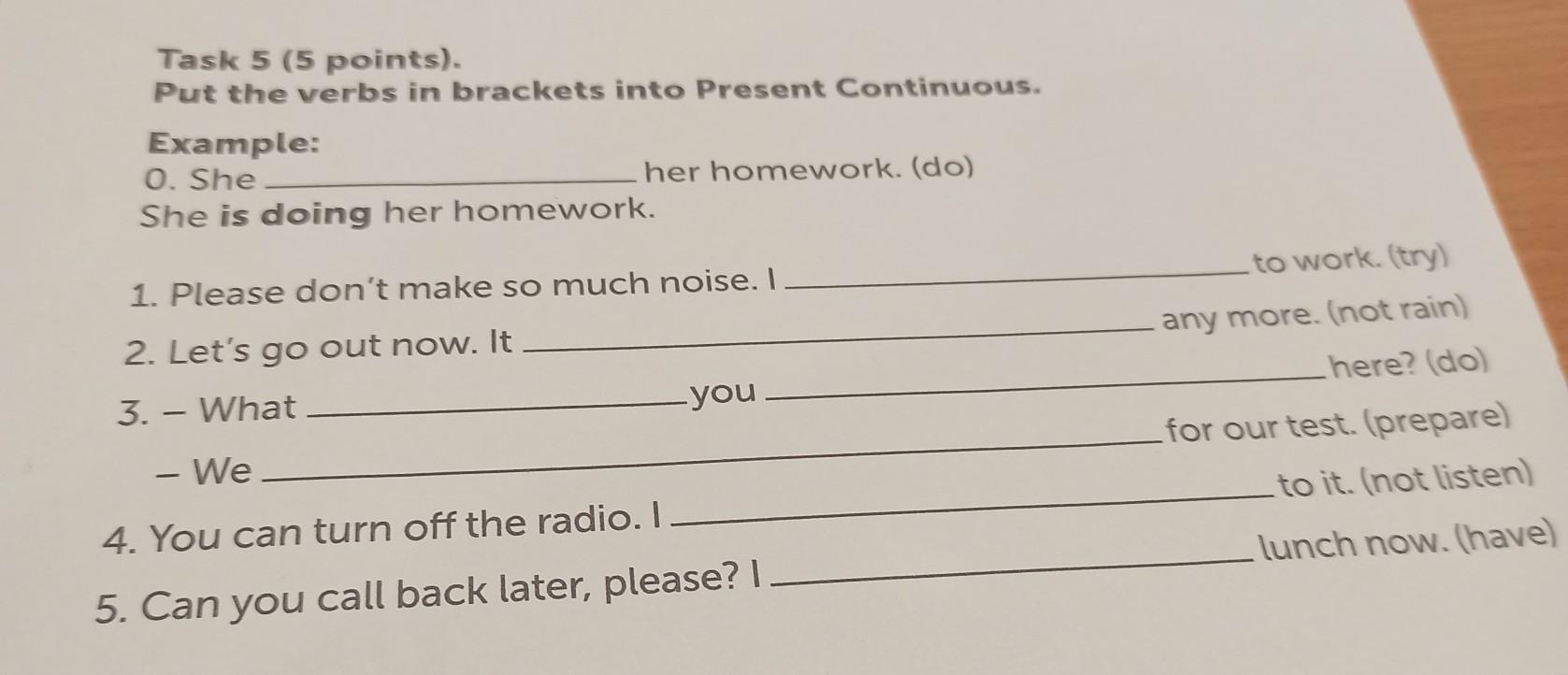 Task 5 (5 points). Put the verbs in brackets into Present Continuous. Example: 0. She her homework. (do) She is doing her homework. to work. (try) 1. Please don't make so much noise. I 2. Let's go out now. It any more. (not rain) 3. – What you - We here? (do) for our test. (prepare) to it. (not listen) lunch now. (have) 4. You can turn off the radio. I 5. Can you call back later, please? |