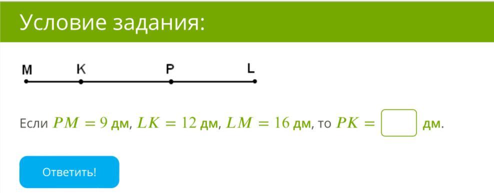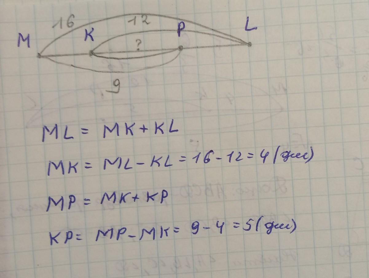 всего 16 дм отрезок лк 12 дм из 16 отнимаем 9 получаем 5 дм