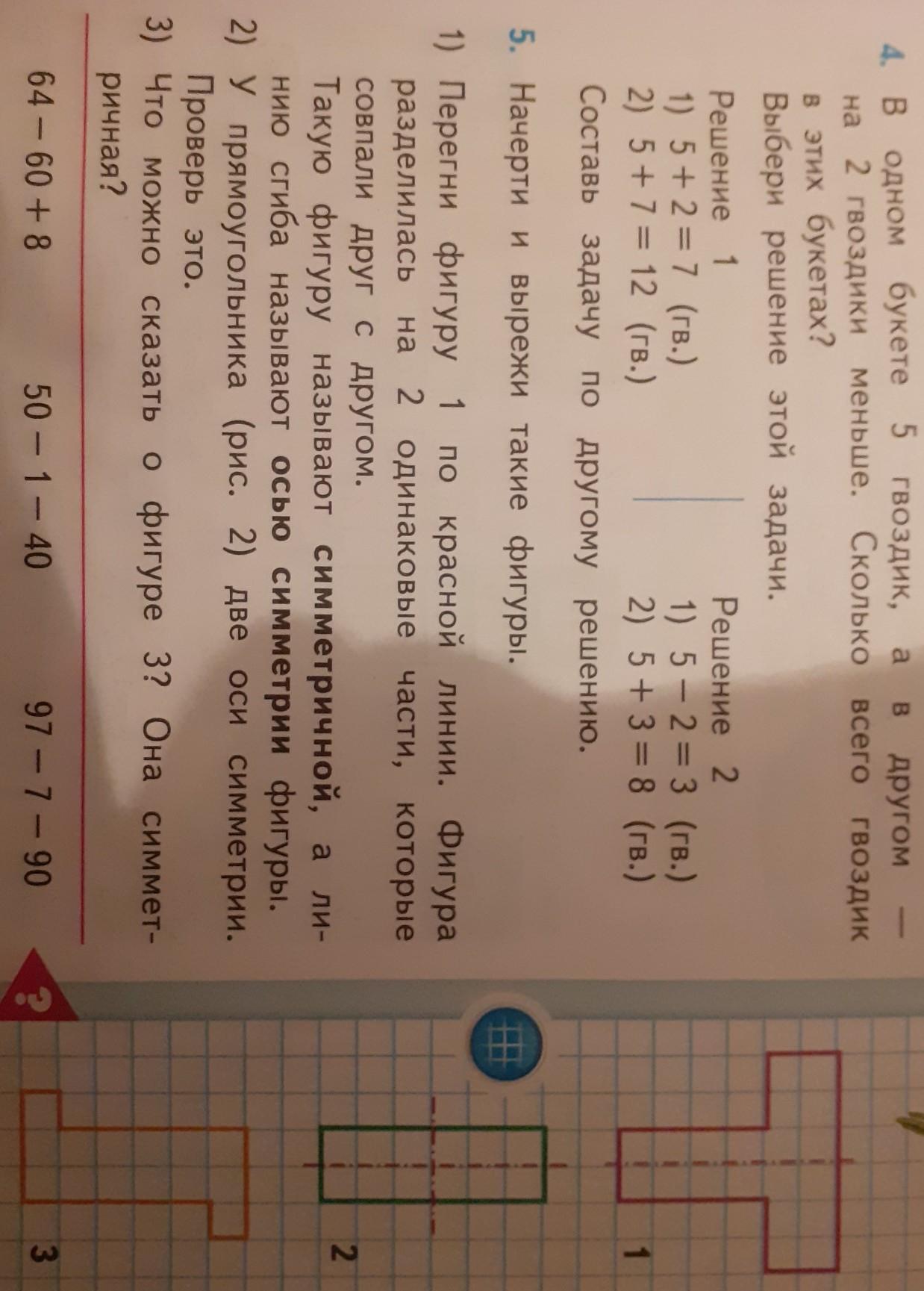 начерти и вырежи 1 по красной линии.Фигура разделилась на одинаковые части, которые совпали друг с другом. Такую фигуру наз. симитричной, а линию сгиба наз. осью симметрии фигуры 2) У прямоугольника две оси симметрии проверь его 3)что можно сказать о фигуре 3? она симетричная?