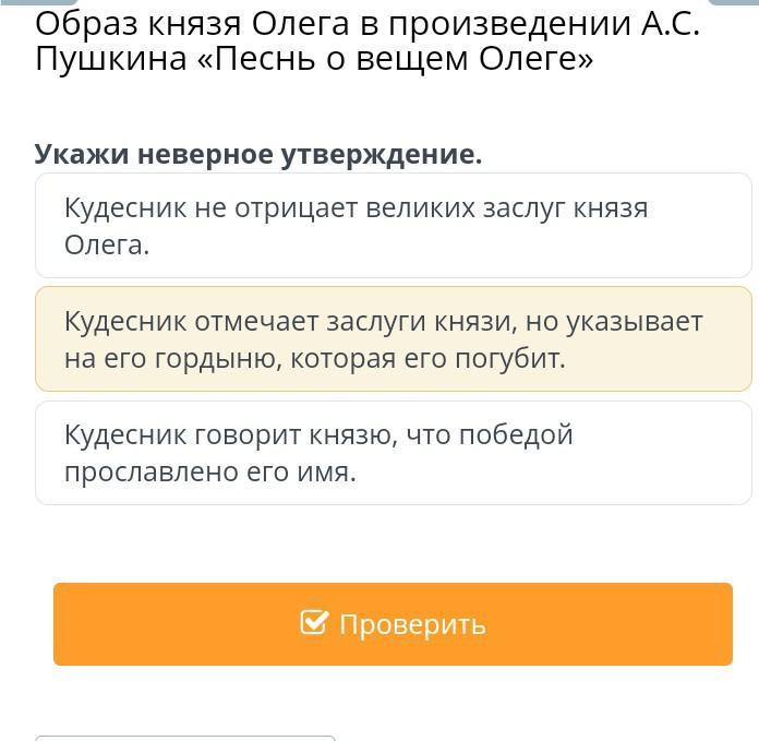 Укажи неверное утверждение. Кудесник не отрицает великих заслуг князя Олега. Кудесник отмечает заслуги князи, но указывает на его гордыню, которая его погубит. Кудесник говорит князю, что ПОБЕДОЙ прославлено его имя. Проверить Назад onlinemektep.org пжжжж помогите