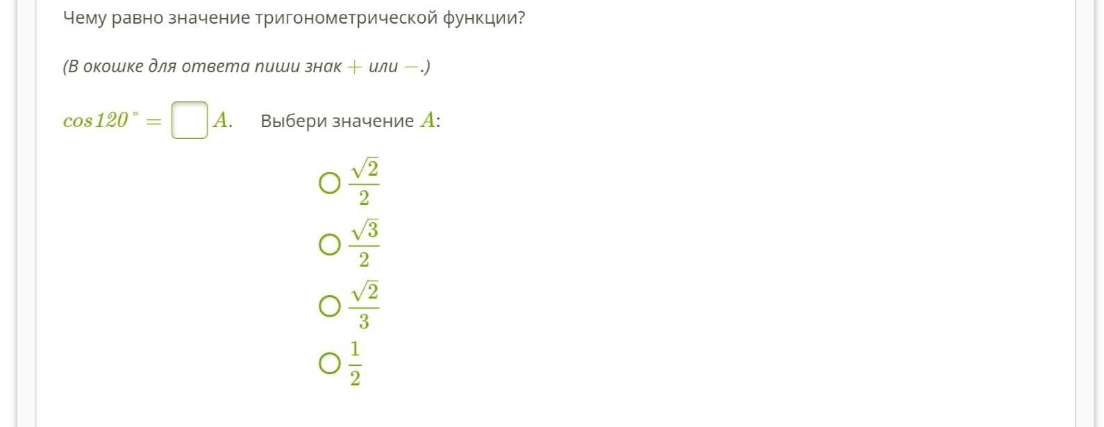 Ответ: Cos(120°) = -sin(30°) = -1/2