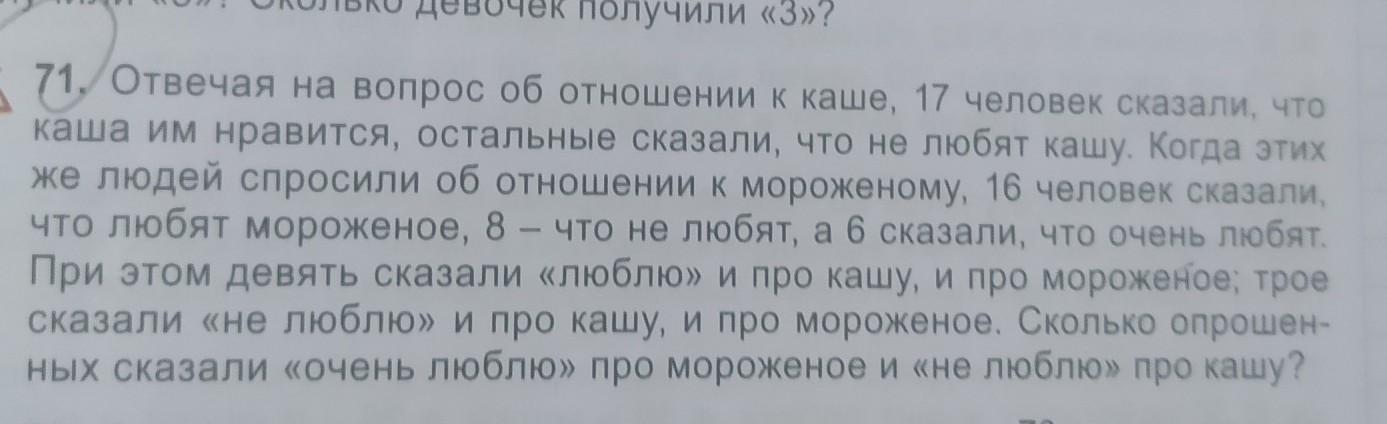 ько девочек получили «3»? 71. /Отвечая на вопрос об отношении к каше, 17 человек сказали, что каша им нравится, остальные сказали, что не любят кашу. Когда этих же людей спросили об отношении к мороженому, 16 человек сказали, что любят мороженое, 8 – что не любят, а б сказали, что очень любят. При этом девять сказали «люблю» и про кашу, и про мороженое; трое сказали «не люблю» и про кашу, и про мороженое. Сколько опрошен- ных сказали «очень люблю» про мороженое и «не люблю» про кашу?Как решить