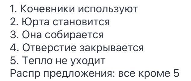 1.Кочевники используют для жилья переносные юрты 2.Юрта легко ставится за час силами одной семьи 3.Она собирается из длинных жердей. 4.На ночь решëтчатое отверстие в потолке закрывается.5.Тепло не уходит.