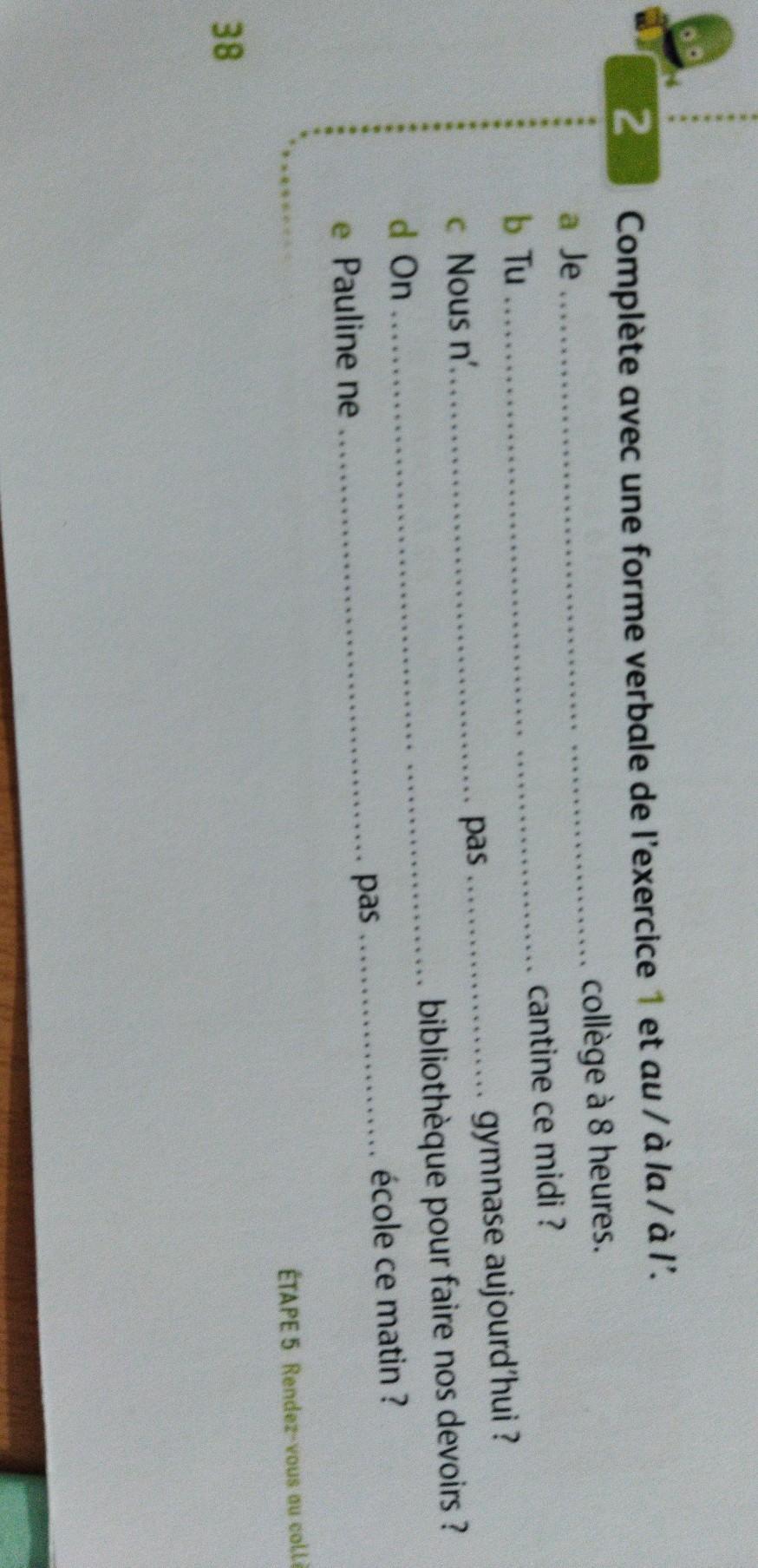 2 Complète avec une forme verbale de l'exercice 1 et au/à la/à l'. a Je... collège à 8 heures. b Tu ...... cantine ce midi? « Nous n... pas...... - gymnase aujourd'hui ? d On.... bibliothèque pour faire nos devoirs ? e Pauline ne pas.. .... école ce matin? ETAPES Rendez-vous ou collige 38. На французском!!