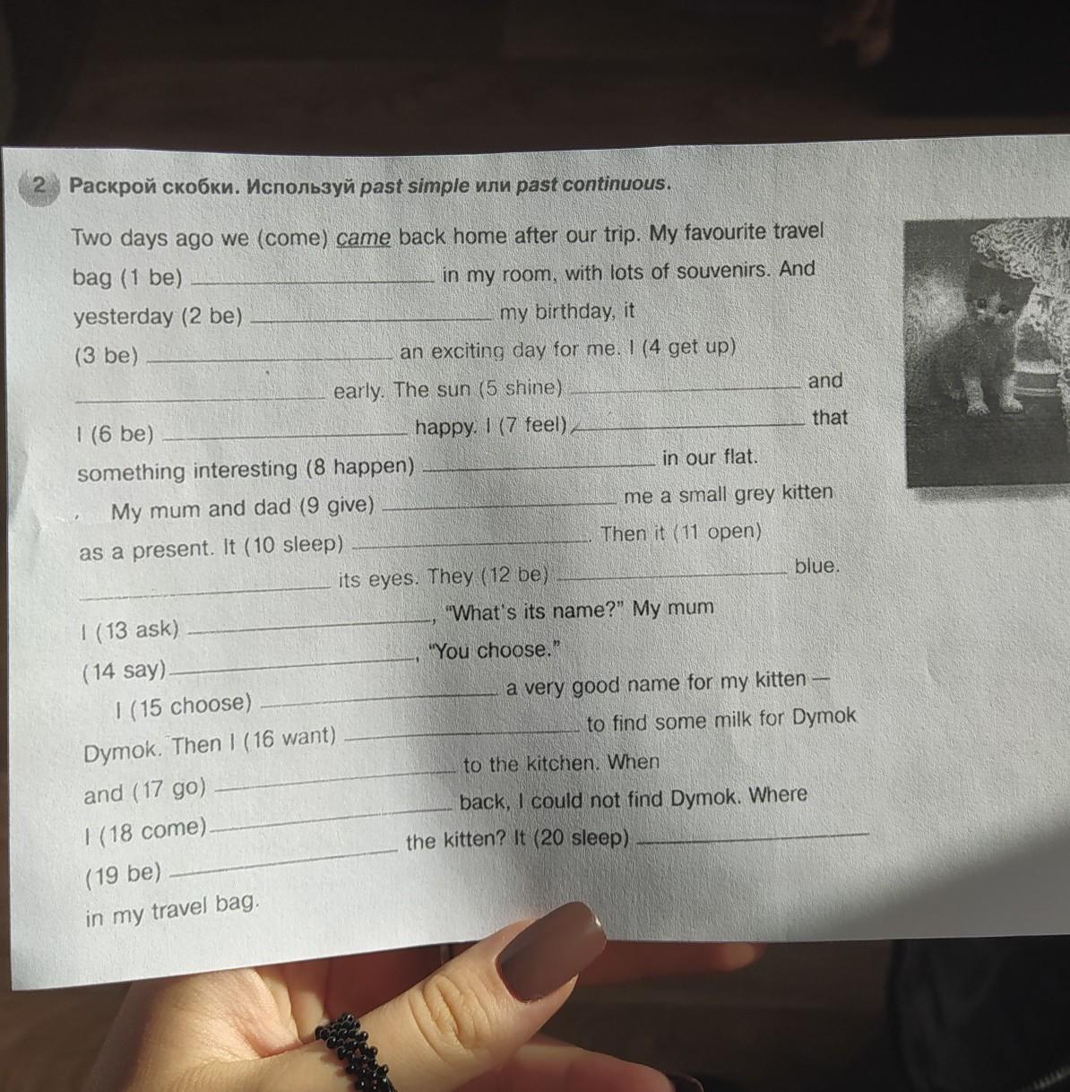 Раскрой скобки. Используй past simple или раѕt continuous. Two days ago we (come) came back home after our trip. My favourite travel bag (1 be) in my room, with lots of souvenirs. And yesterday (2 be) my birthday, it (3 be) an exciting day for me. I (4 get up) early. The sun (5 shine) and (6 be) happy. I (7 feel) that something interesting (8 happen) in our flat. My mum and dad (9 give) me a small grey kitten as a present. It (10 sleep) Then it (11 open) its eyes. They (12 be) blue. I (13 ask) - "What's its name?" My mum (14 say) "You choose." I (15 choose) a very good name for my kitten- Dymok. Then I (16 want) to find some milk for Dymok and (17 go) to the kitchen. When 1 (18 come) back, I could not find Dymok. Where (19 be) the kitten? It (20 sleep) in my travel bag.