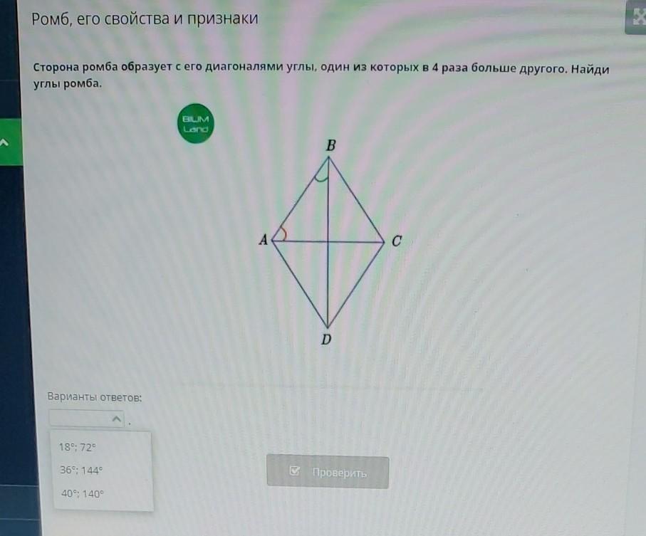 Пусть угол АBD=х, тогда угол ВАС=4х. Используйте свойство диагоналей ромба, составьте и решите уравнение х+4х=90, х=18. Используйте свойство диагоналей ромба, вычислите углы ромба угол АBС=2уголАBD= 2:18°=36°, уголBAD= 2угол ВАC=8:18°=144°.