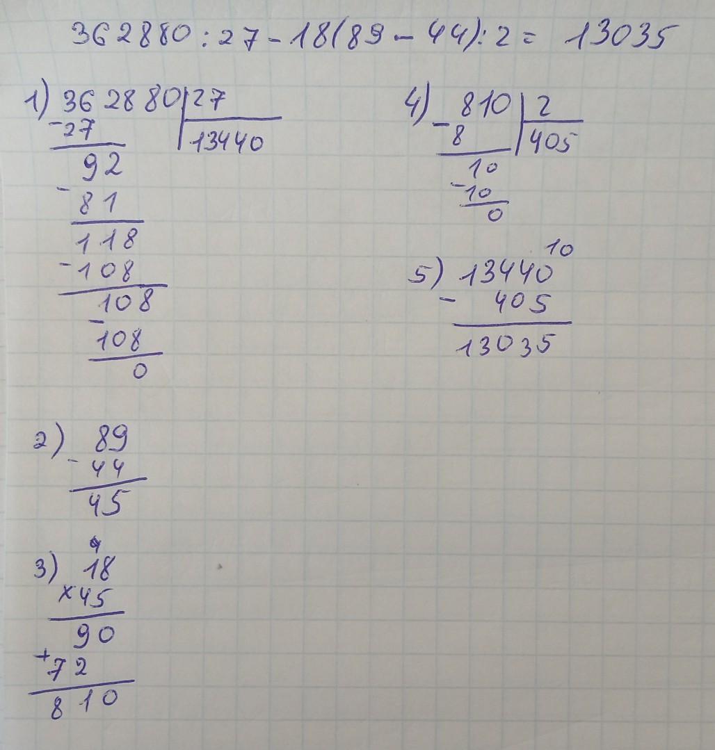 Найди значение выражения 362880:27−18⋅(89−44):2.