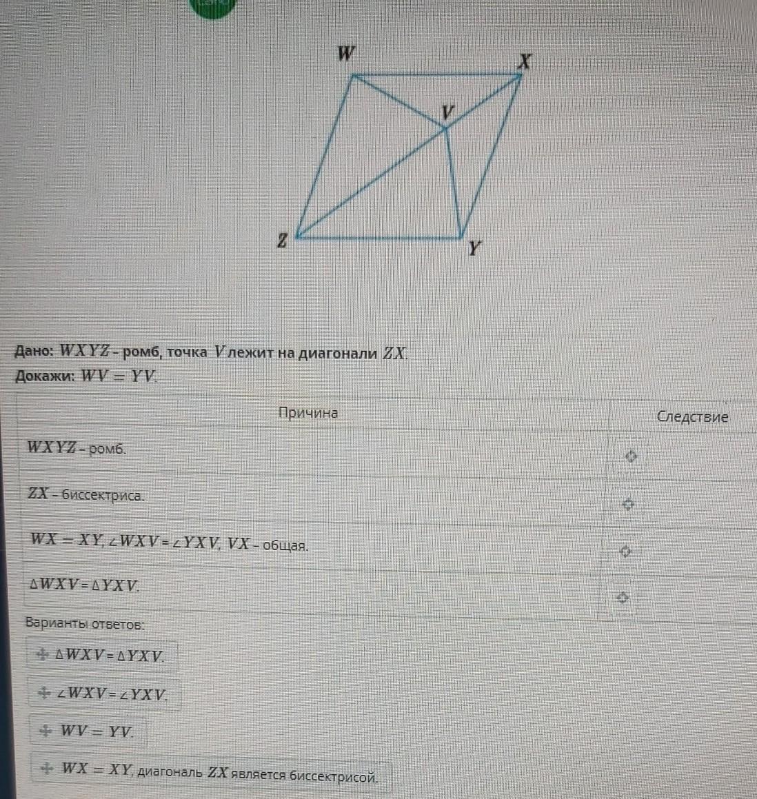1 — WX = XY, диагональ ZX - биссектриса;