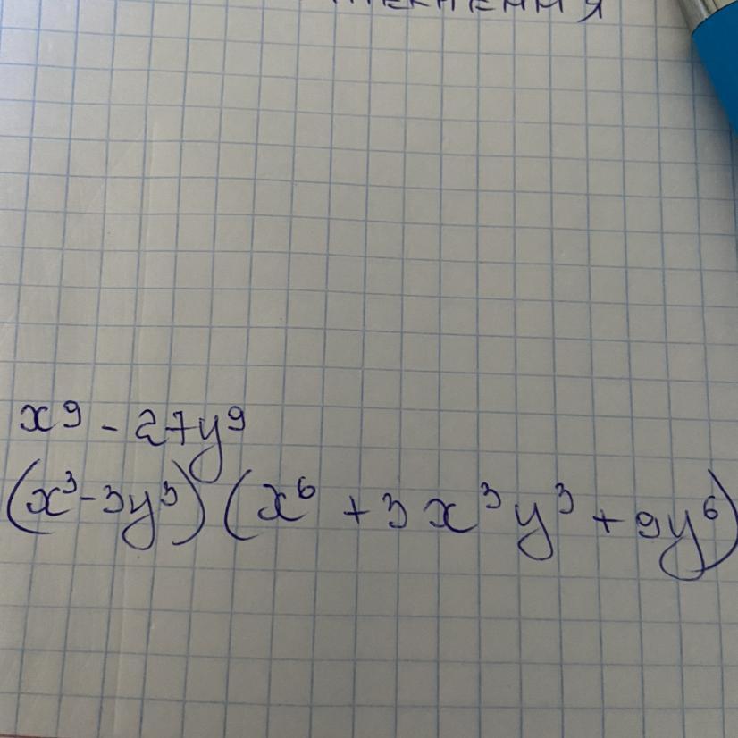 х⁹-27y⁹=(х³-3у³)(х⁶+3х³у³+9у⁶)