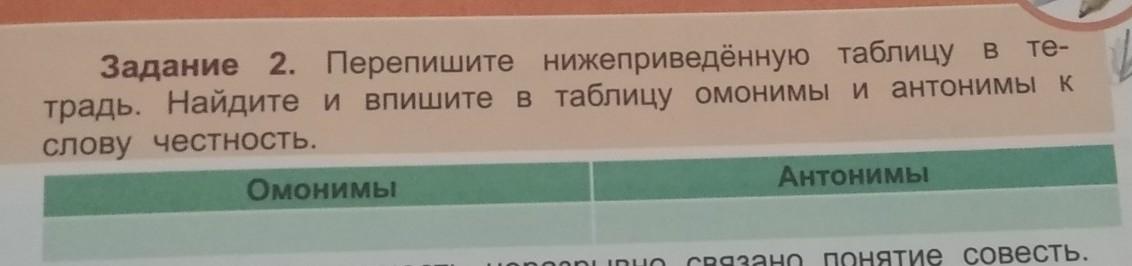Задание 2. Перепишите нижеприведённую таблицу в те- традь. Найдите и впишите в таблицу омонимы и антонимы к слову честность. Омонимы Антонимы