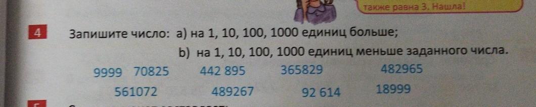 Запишите число: а) на 1, 10, 100, 1000 единиц больше; b) на 1, 10, 100, 1000 единиц меньше заданного числа. 9999 70825 442 895 365829 482965 561072 489267 92 614 18999