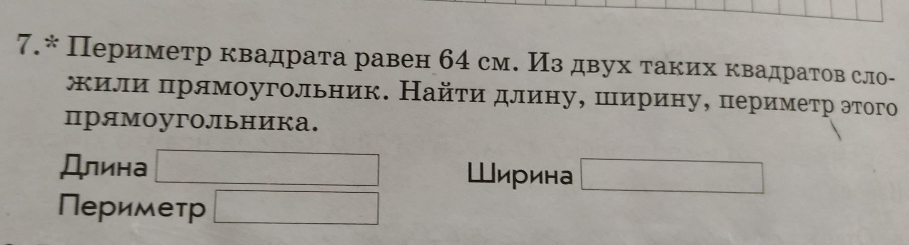 Периметр квадрата равен 64 см, значит сторона квадрата будет равна: 64:4=16 см Так как из двух квадратов мы должны сделать прямоугольник ширина прямоугольника будет равна стороне квадрата 16 см, а длина: 16*2=32 см. Периметр прямоугольника равен: Р=16*2+32*2=32+64=96 см.
