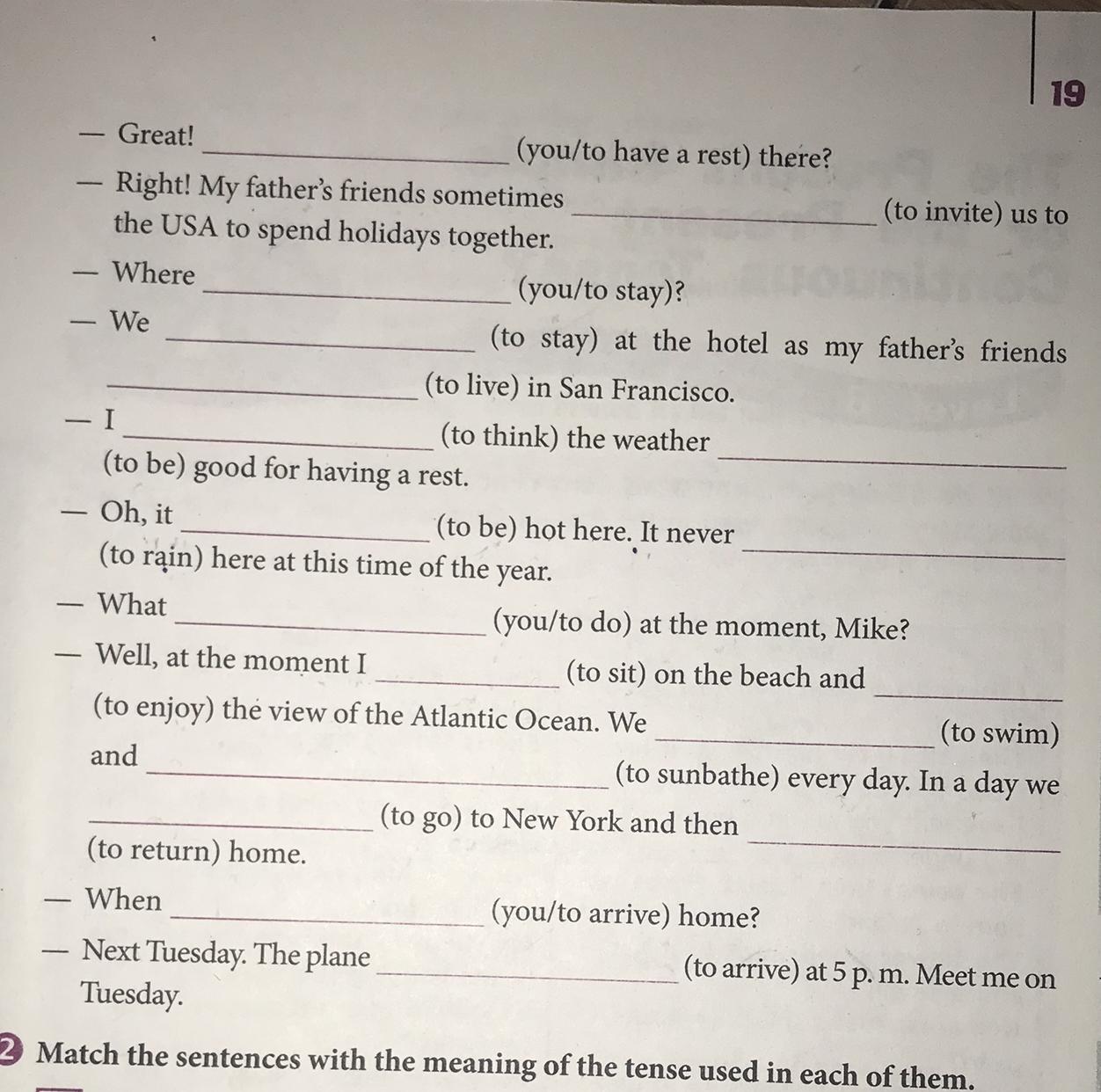 8. am sitting; enjoying; swim; sunbathe; go; return;