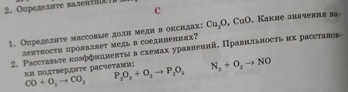 1. Определите массовые доли меди в оксидах: Cu0, CuO. Какие значения на лентности проявляет медь в соединениях? ещё 2 задание сделай