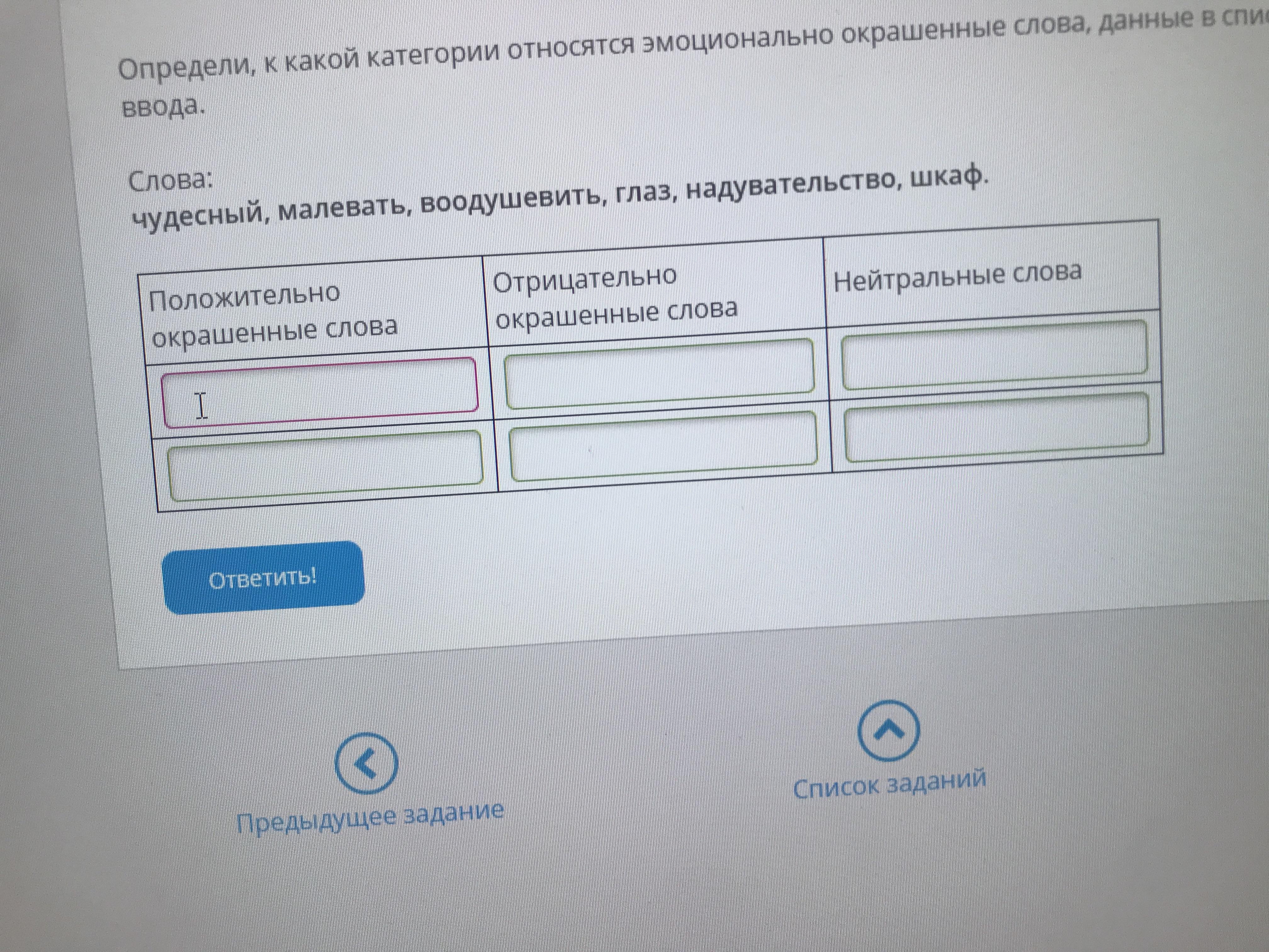 Определи к какой категории относятся эмоционально окрашенные слова данные в списке впиши их в поле ввода слова чудесный малевать воодушевить глаз надувательство шкаф