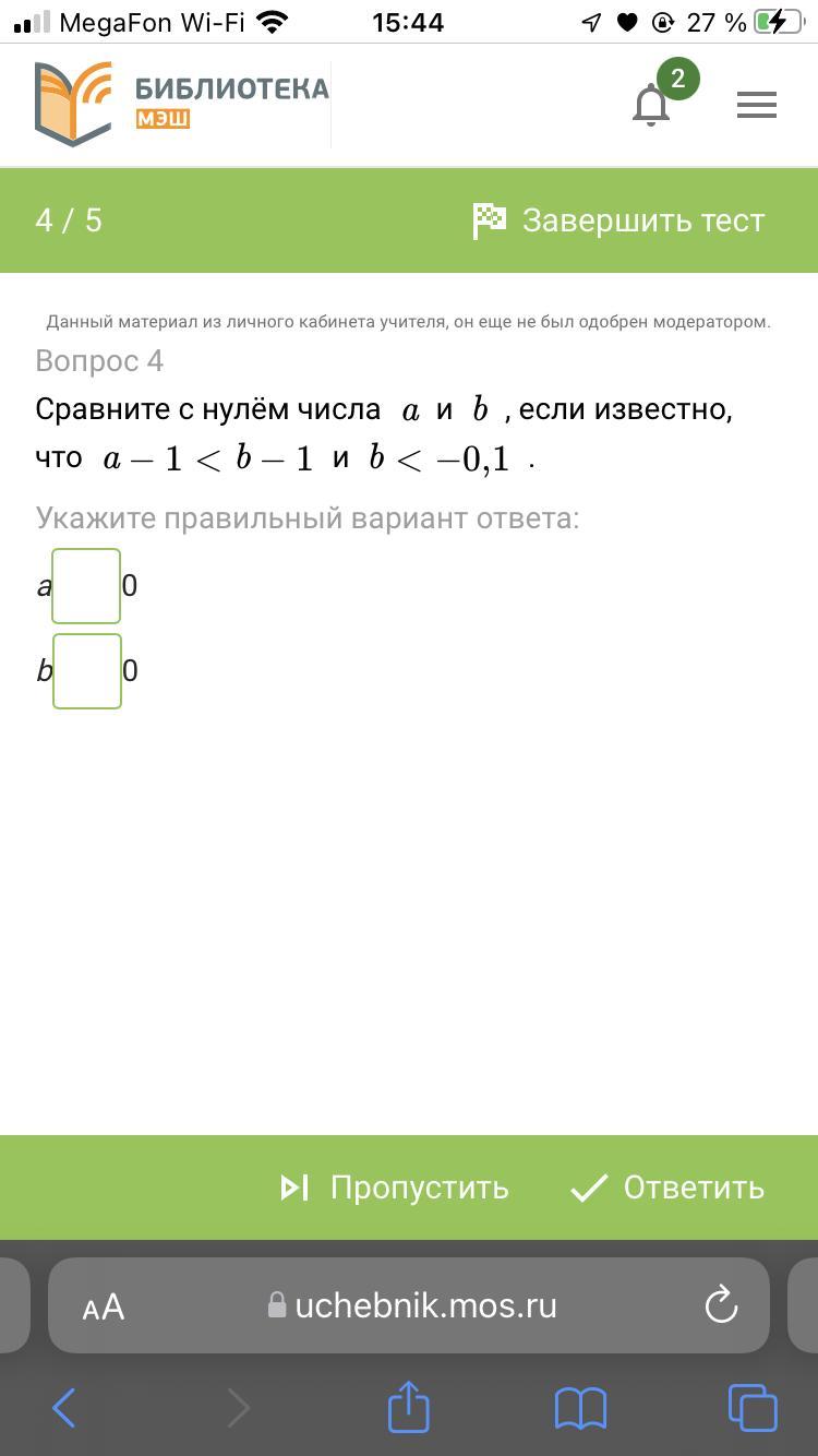 Сравните с нулём числа a и b , если известно, что a − 1 < b − 1 и b < − 0 , 1 . Укажите правильный вариант ответа: