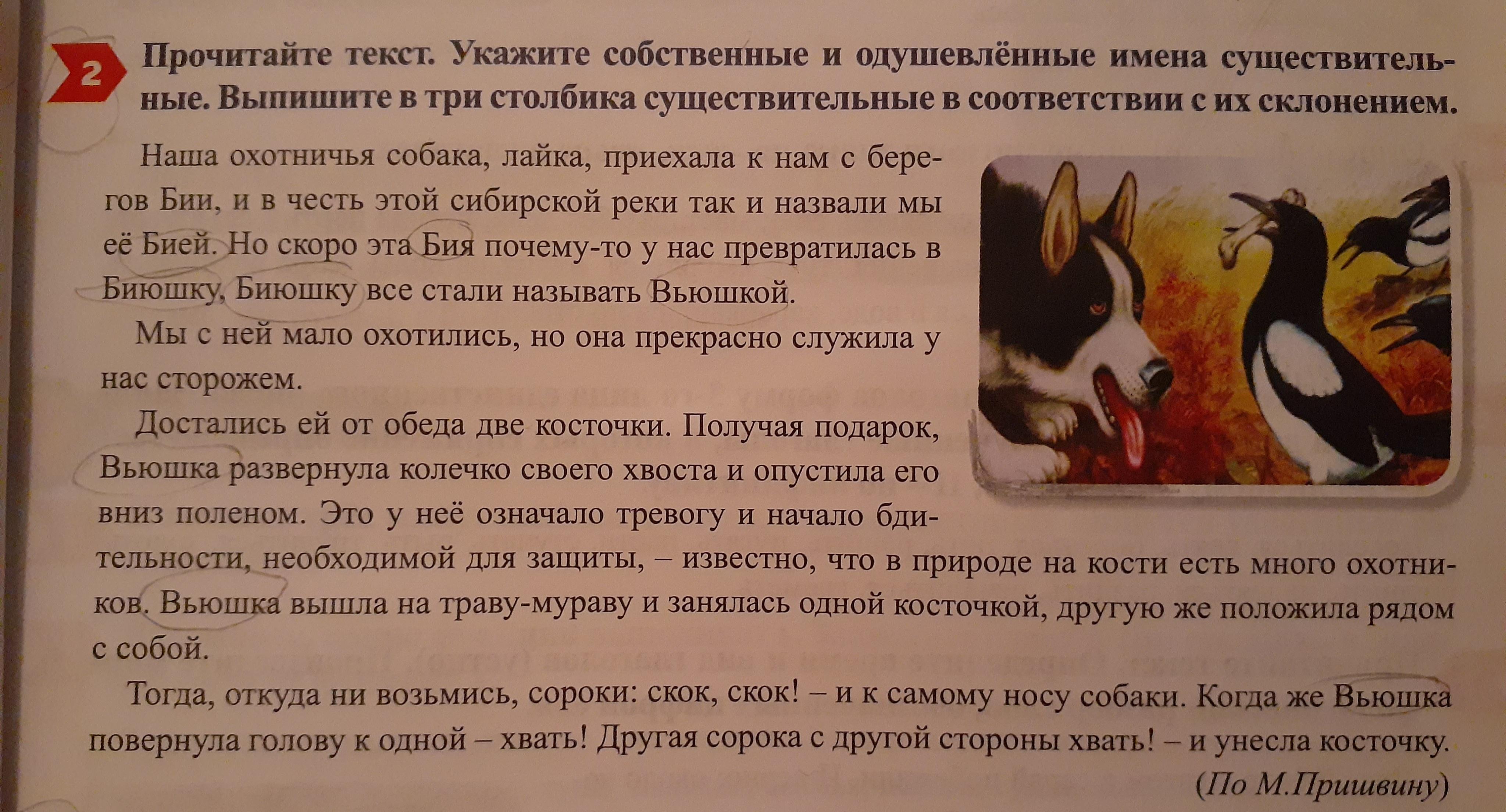Прочитайте текст. Укажите собственные и одушевлённые имена существительные. Выпишите в три столбика существительные в соответствии с их склонением