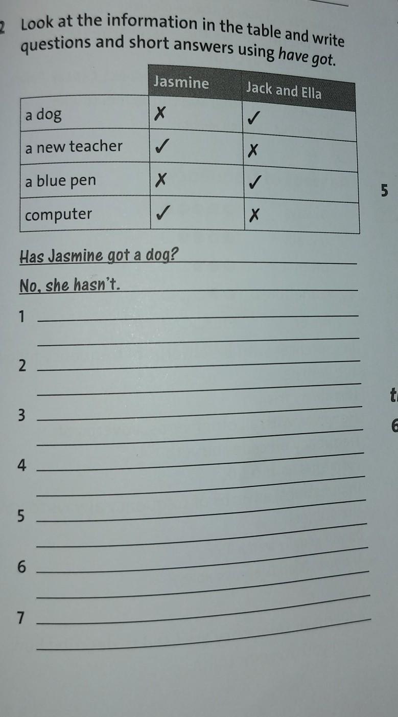 1 2 Look at the information in the table and write questions and short answers using have got. Jasmine 2 Jack and Ella X ✓ a dog ✓ Х a new teacher Х ✓ a blue pen ✓ Х computer Has Jasmine got a dog? No, she hasn't. 1 2 3 4 5 6 7
