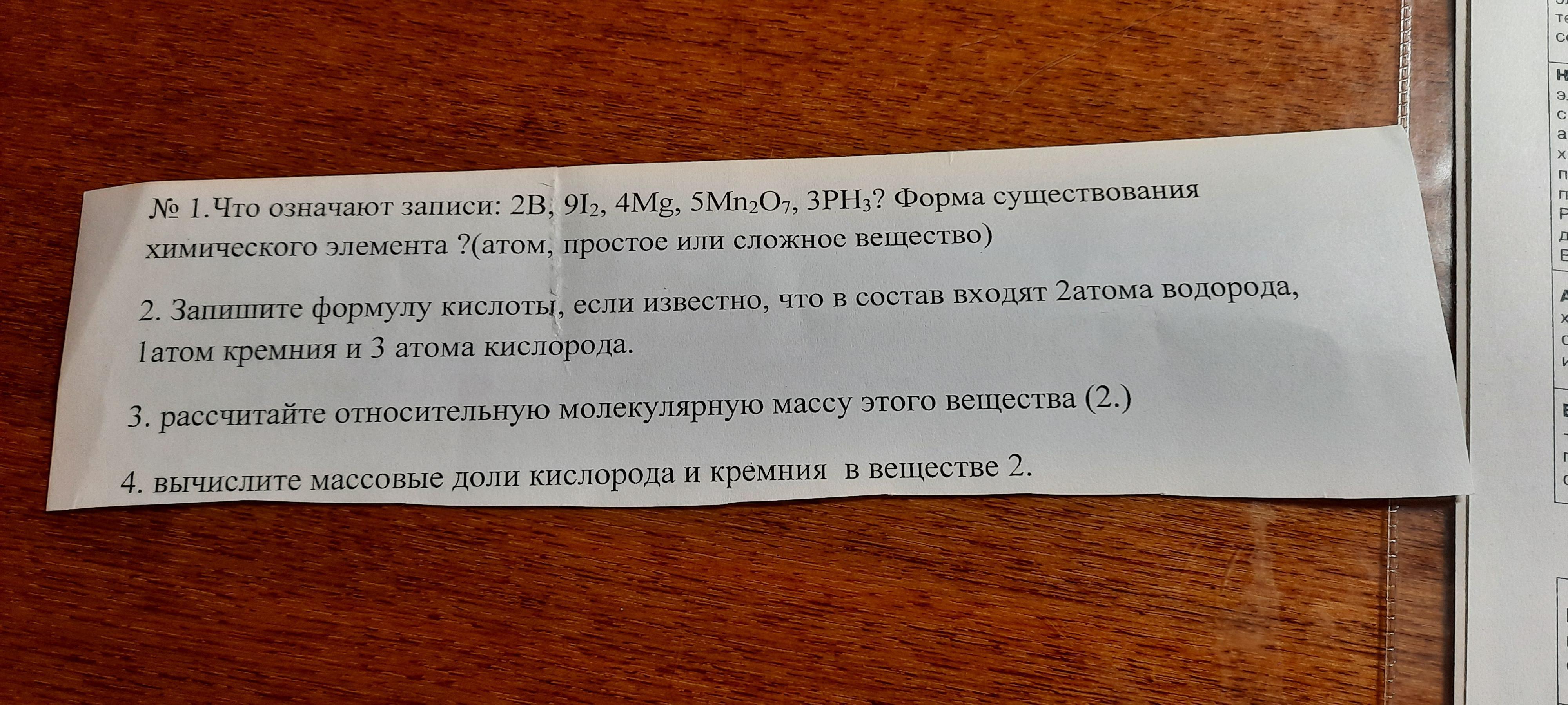 1. Что означают записи: 2B, 9I², 4Mg5. 5Mn207, 3PH3? Форма существования химического элемента ?(атом, простое или сложное вещество) 2. Запишите формулу кислоты, если известно, что в состав входят 2атома водорода, облади кремния и 3 атома кислорода. 3. рассчитайте относительную молекулярную массу этого вещества (2.) 4. вычислите массовые доли кислорода и кремния в веществе 2. Κο