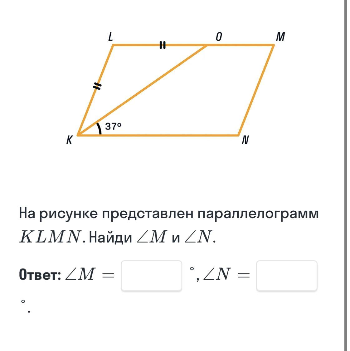 В параллелограмме противоположные углы равны. Отсюда следует, что угол К равно углу М. И соответственно сумма углов на одной стороне параллелограмма будет равна 180°, а значит, что угол N=180°-74°=106°