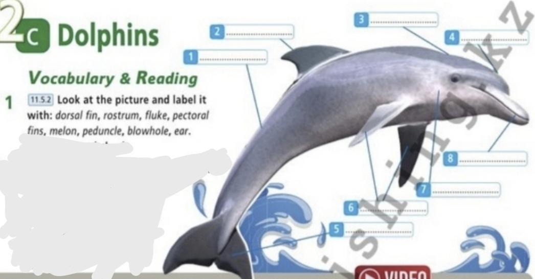 Look at the picture and label it with: dorsal fin, rostrum, fluke, pectoral fins, melon, peduncle, blowhole, ear.