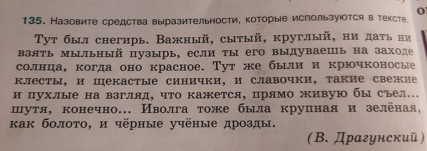 Важный, сытый, круглый снегирь; крючконосые клесты; щекастые синички; свежие и пухлые славочки; крупная и зелёная иволга; чёрные учёные дрозды — эпитеты;ни дать ни взять мыльный пузырь; как болото — сравнения.