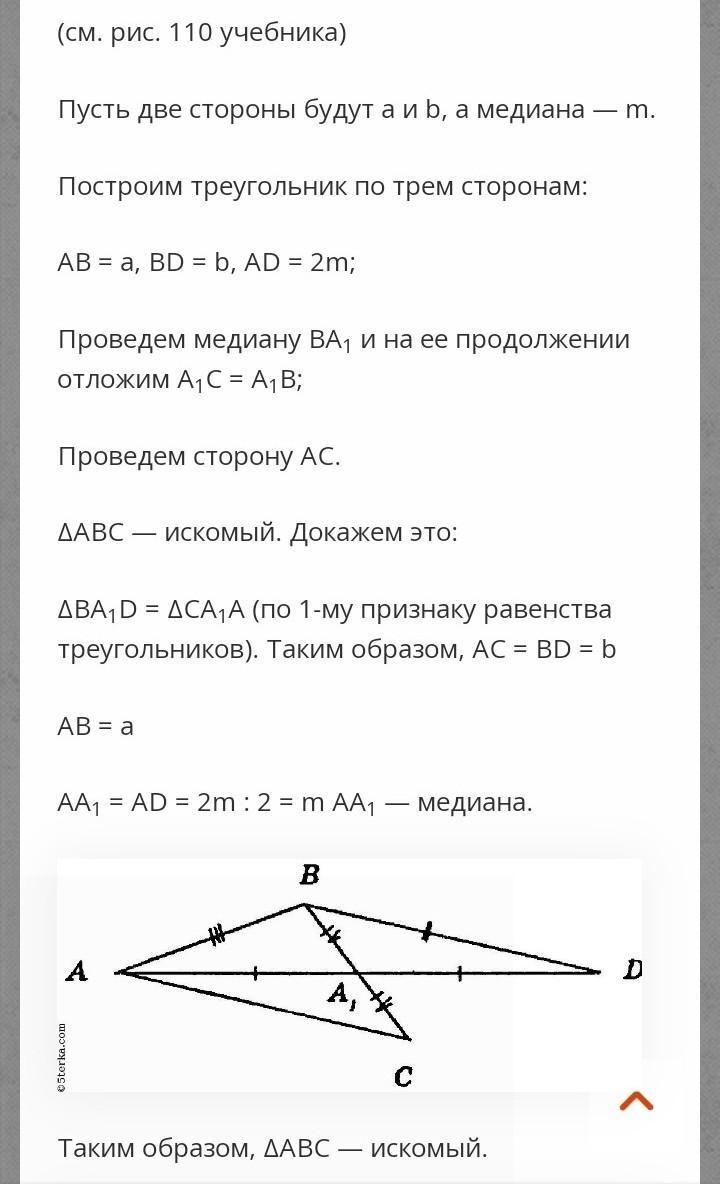 Постройте треугольник по двум его сторонам и медиане, проведённой к третьей стороне