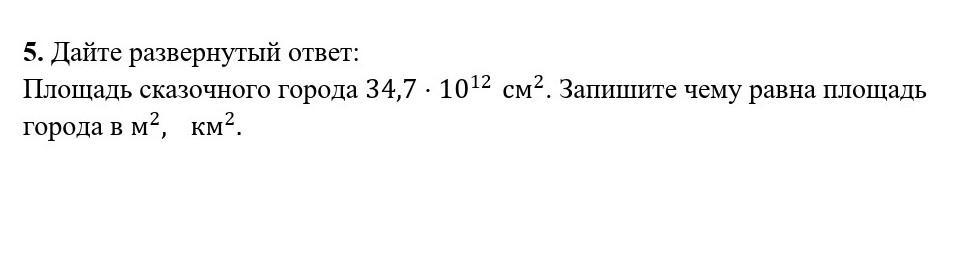 Площадь сказочного города 34,7⋅10^12 см^2. Запишите чему равна площадь города в м^2,  км^2