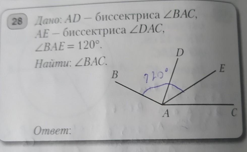 Тк угол ВАЕ состоит из углов ВАД и ДАЕ , то Получаем уравнение 2х+х=120.........х=40 . Угол ВАС=4*х=.....