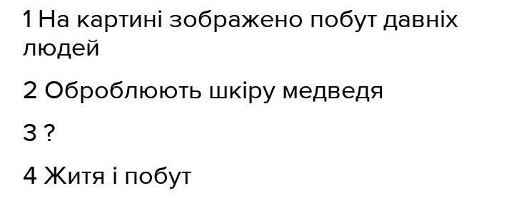 1. Роздивіться картину. Кого та що зображено? 2. Що роблять зображені на картині люди? 3. Який епізод життя мешканців пізнього палеоліту зображено? 4. Які історичні знання втілив у картині художник?