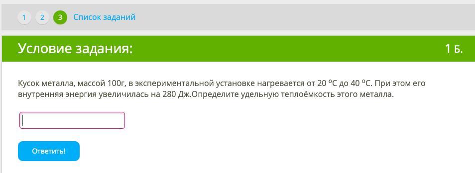 c=Q/(m*(t2-t1))=280/(0.1*(40-20))=140 Дж/(кг*С)