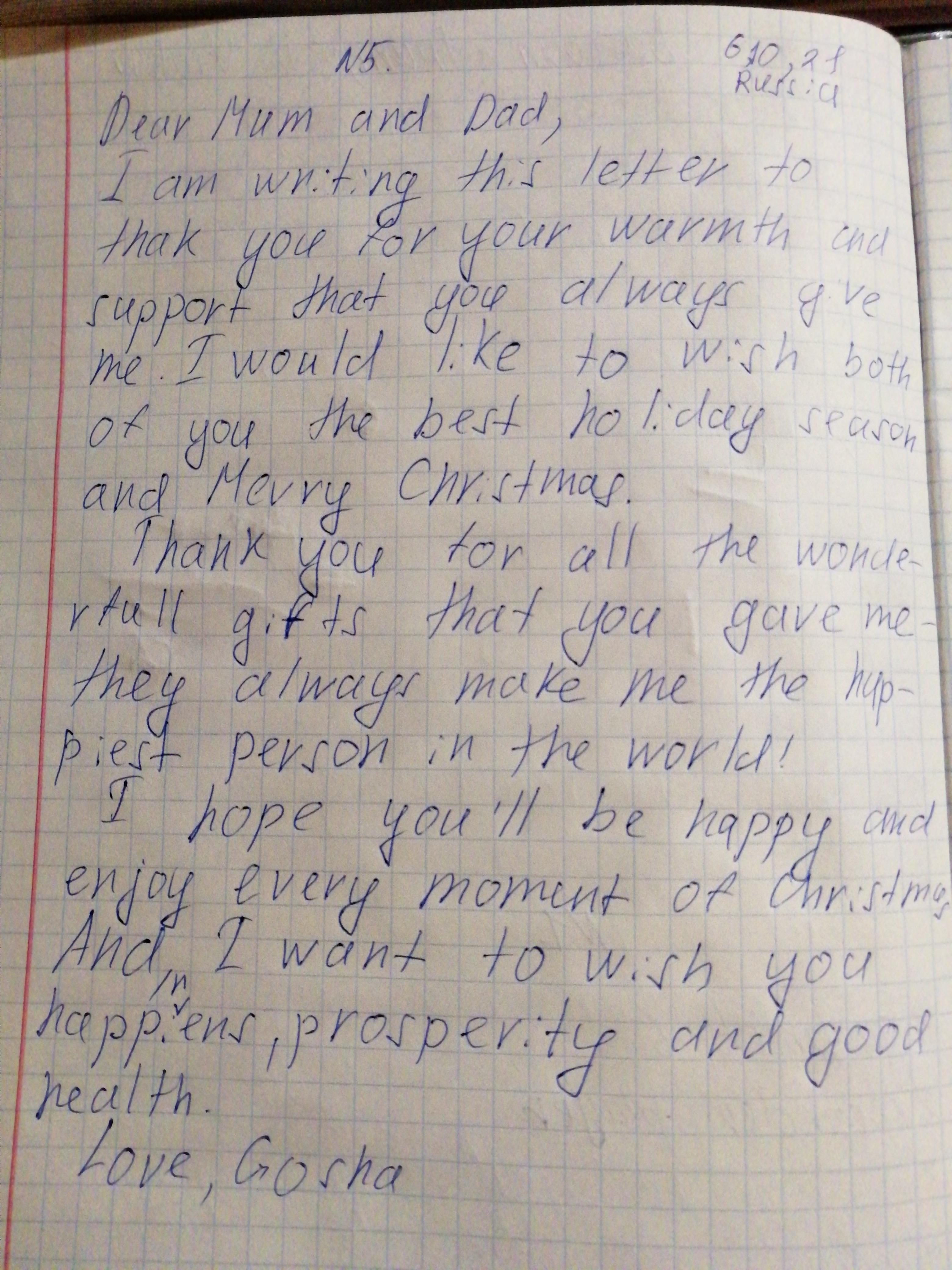Write a christmas card to your parents. You can: o say thank you' - Thanks for helping me! o express hope - Thope you have a great Christmas season! … o wish them well – Have a Merry Christmas! o tell them about their good qualities - You are always there for me! o send them your wishes – Wishing you the best this season has to offer!