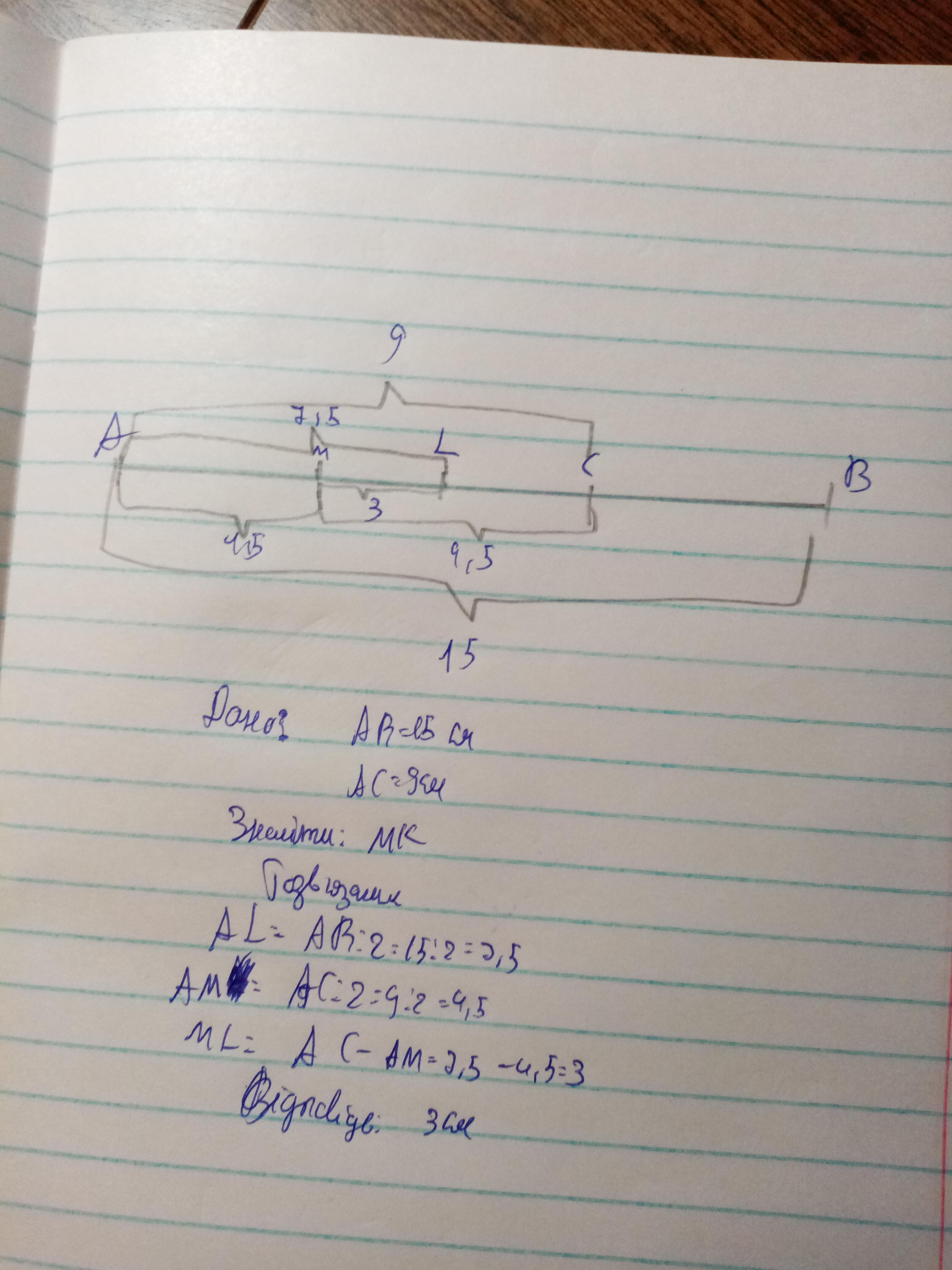 Дано: відрізок АВ=15 см, АС=9 см. Знайти МК.
