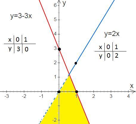 строим прямые y=2x и y=3-3x по двум точкам по таблицам на рисунке