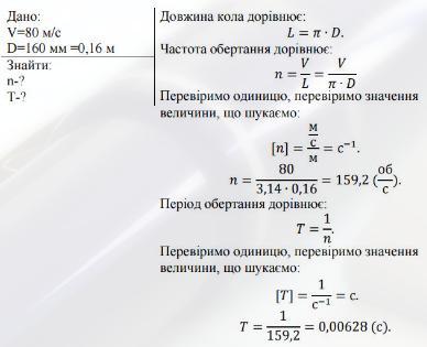Швидкість руху диска «болгарки» (рис. 2) в точці дотику з поверхнею, яку обробляють, повинна бути не меншою ніж 80 м/с. Якими за такої швидкості будуть обертова частота і період обертання диска, якщо його діаметр дорівнює 160 мм?