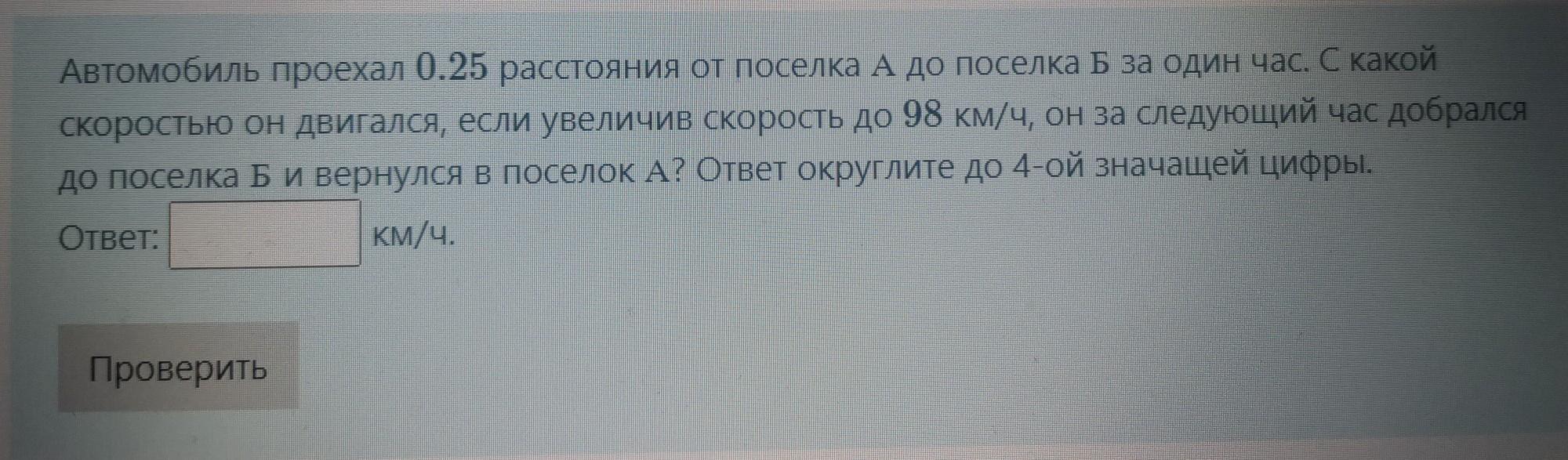 Автомобиль проехал 0.25 расстояния от поселка А до поселка Б за один час. С какой Скоростью он двигался, если увеличив скорость до 98 км/ч, он за следующий час добрался До поселка Б и вернулся в поселок А? Ответ округлите до 4-ой значащей цифры. Ответ: Км/ч.