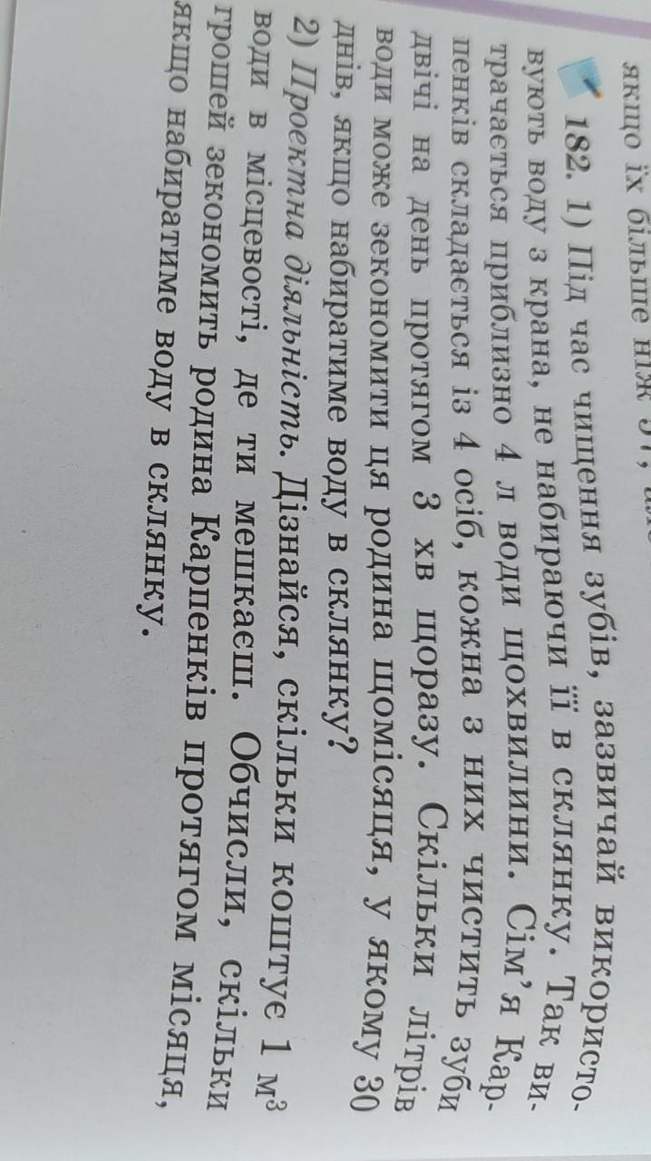 2) Проектна діяльність. Дізнайся, скільки коштує 1 м3 води в місцевості, де ти мешкаєш. Обчисли, скільки грошей зекономить родина Карпенків протягом місяця, якщо набиратиме воду в склянку
