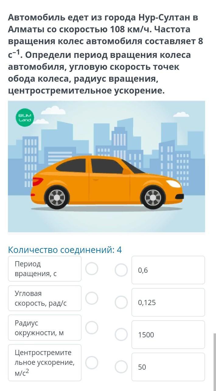 Автомобиль едет из города Нур-Султан в Алматы со скоростью 108 км/ч. Частота вращения колес автомобиля составляет 8 с–1. Определи период вращения колеса автомобиля, угловую скорость точек обода колеса, радиус вращения, центростремительное ускорение.Даю 30 баллов!