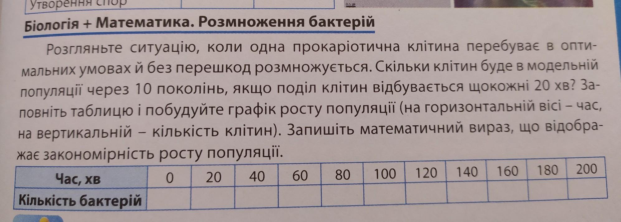 Біологія + Математика. Розмноження бактерій. (допоможіть з таблицею)